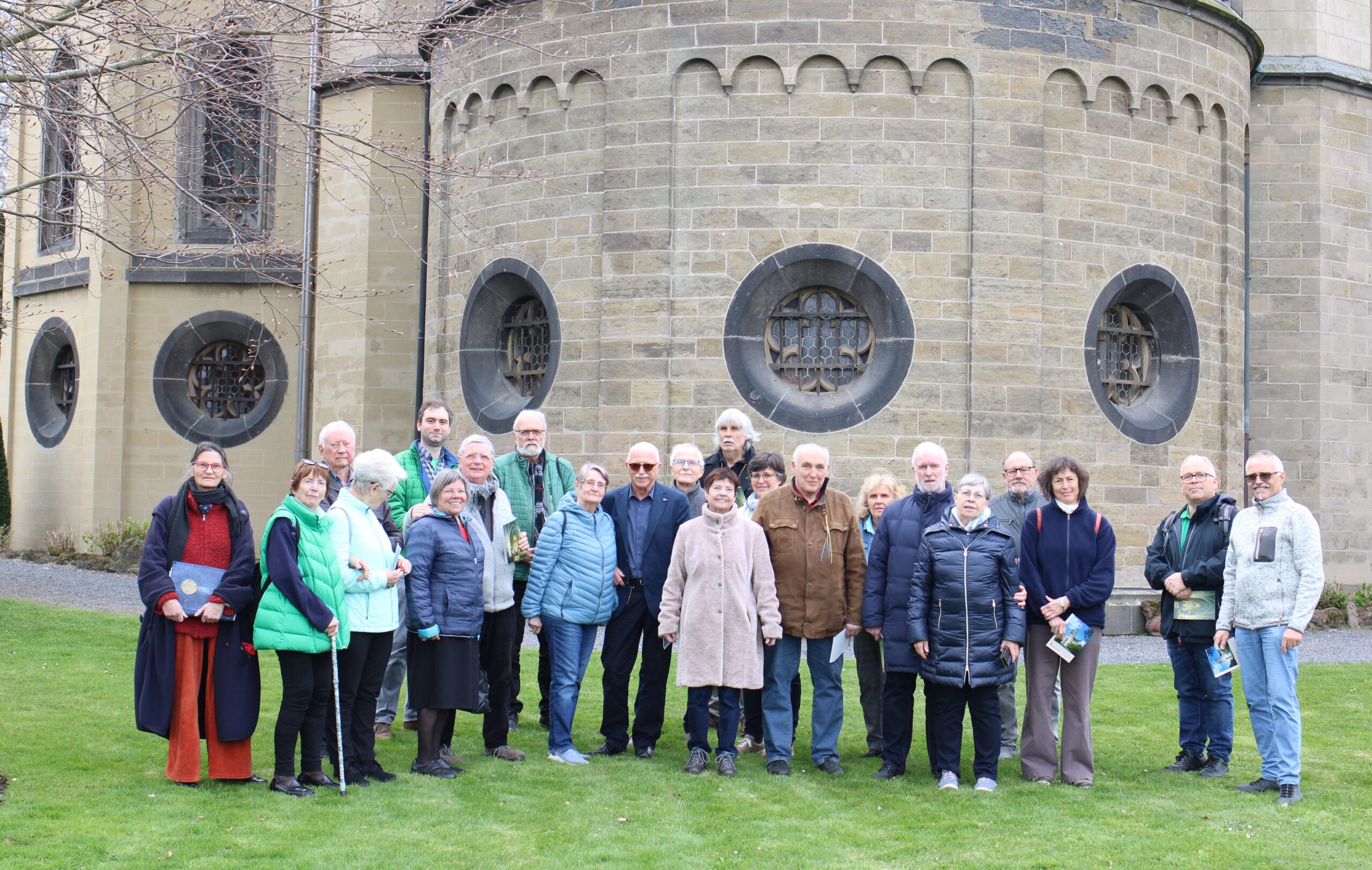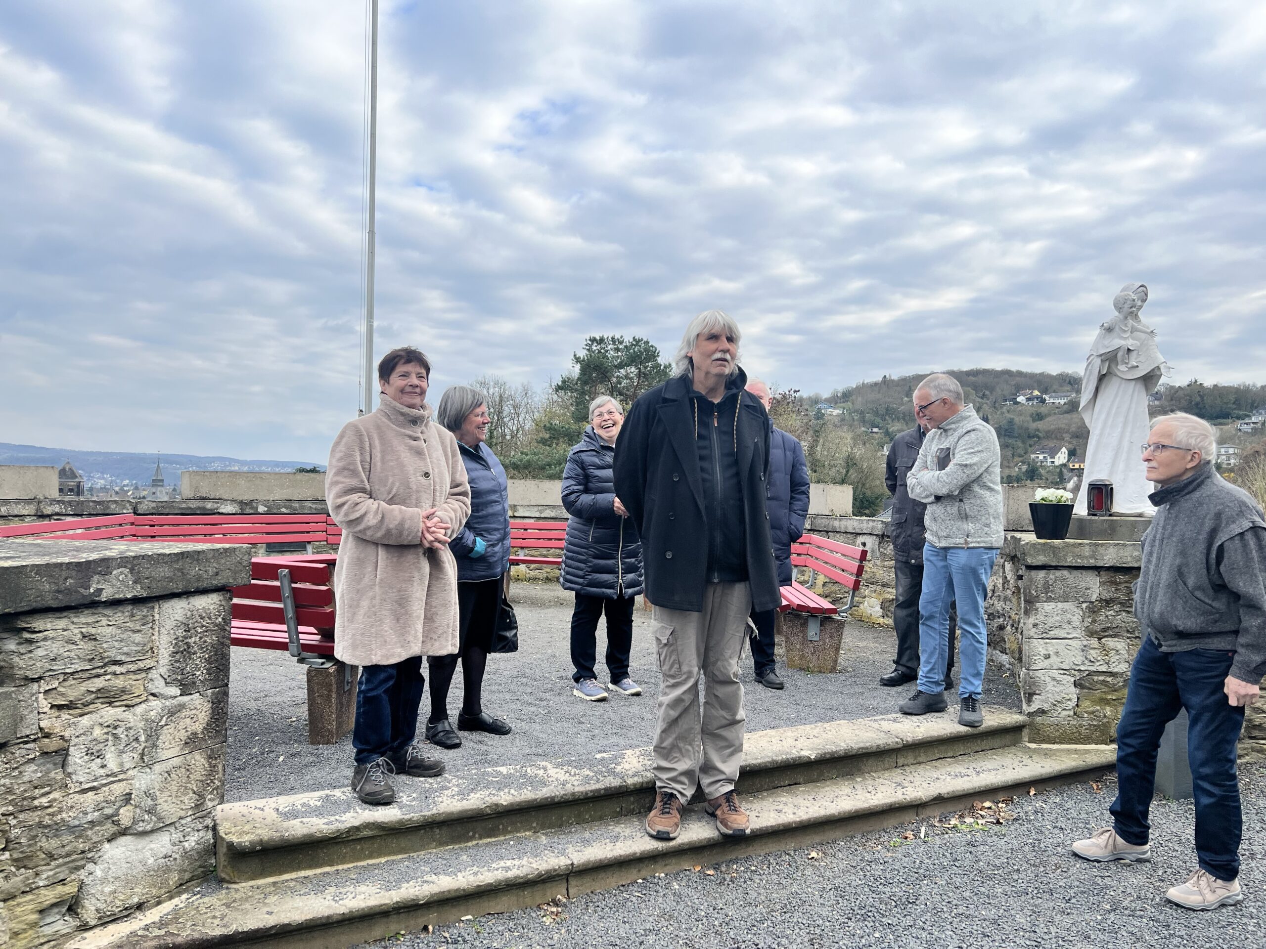 Bei schönstem Sonnenschein endete die Exkursion auf der Terrasse vor der Apsis der Kirche. Dort bot sich den Teilnehmern ein wunderbarer Ausblick auf den Rheinverlauf von der Erpeler Ley bis zum Drachenfels. Agnes Menacher dankte in Vertretung des Vereinsvorsitzenden Hardy Rehmann Herrn Wacker für die kompetente und abwechslungsreiche Führung und überreichte ihm das fast schon legendäre Weinpräsent. Im Anschluss traf man sich noch in einem Lokal am Rhein zum gegenseitigen Austausch. Die nächste Exkursion des Vereins führt am 25. April ins DB-Museum nach Koblenz, wo die ganze Welt der Eisenbahn zu erleben ist. Dazu sind nicht nur Vereinsmitglieder, sondern auch interessierte Gäste herzlich eingeladen.