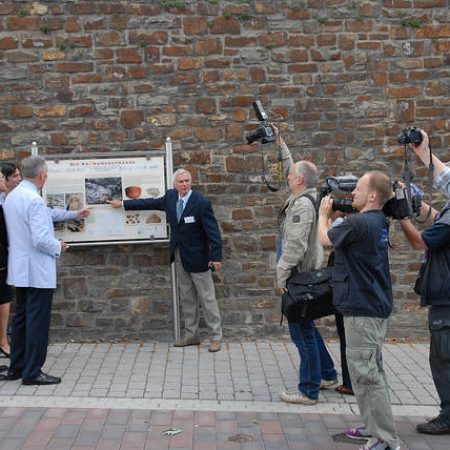 Dem Verein zur Förderung der Denkmalpflege und des Heimatmuseums in Sinzig ist es ein zentrales Anliegen, die Geschichte der Stadt Sinzig sichtbar zu machen. Vorsitzender Dr. Günther Schell dankte beim anschließenden Treffen im Kirchen-Café der katholischen Pfarrgemeinde St. Peter insbesondere Karl-Friedrich Amendt, der als zweiter Vorsitzender des Vereins zusammen mit dem verantwortlichen Grafiker Andreas Schmickler die Arbeiten konzipierte. Karl-Friedrich Amendt hat zum selben Anlass auch eine vom Verein herausgegebene 76 Seiten starke Informationsschrift verfasst, die ebenfalls am Dienstag vorgestellt wurde und für den Preis von drei Euro zu erwerben ist, verfügbar in den Sinziger Buchhandlungen, bei der Tourist Information und im Museum.