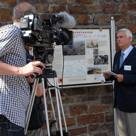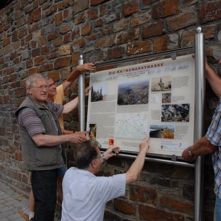 Sinzig. Der Verlauf der historischen Aachen-Frankfurter-Heerstraße durch das heutige Sinzig ist jetzt für Passanten nachvollziehbar. Zwei großformatige Informationstafeln, maßgeblich gefördert vom Verein zur Förderung der Denkmalpflege und des Heimatmuseums in Sinzig, geben auf sehr informative und anschauliche Art Auskunft über Bedeutung und Wegführung dieser in der Geschichte Sinzigs so wichtigen Straßenverbindung. In der Zehnthofstraße im Bereich des Zehnthofes, einem der beiden Standorte, hatten sich zur Übergabe an die Öffentlichkeit zahlreiche Gäste und interessierte Bürger eingefunden, darunter der Erste Kreisbeigeordnete Horst Gies, Bürgermeister Wolfgang Kroeger und Sinzigs Ortsvorsteherin Silvia Mühl. Die zweite Informationstafel steht am unteren Ende der Mühlenbachstraße. Auf den Tag genau vor 1250 Jahren, nämlich auf den 10. Juli 762, ist die erste urkundliche Erwähnung Sinzigs datiert, ein Ereignis, das die Stadt Sinzig mit einem Festakt am 27. Oktober ausführlich würdigen wird.